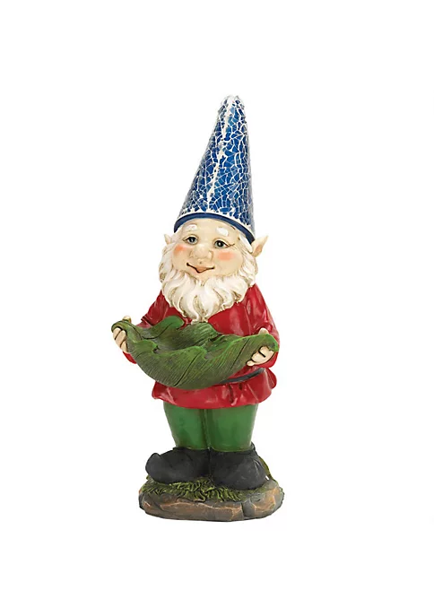 Charming garden gnome offers a leaf full of birdseed for all his feathered friends! His solar panel collects power during the day to light up his hat at night. Birdseed not included.