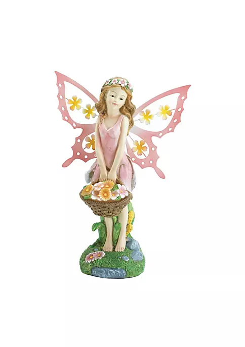 - This garden statue features a pretty fairy with pink wings and lots of flowers.