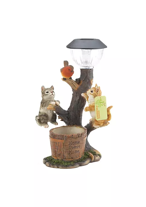 Whimsical garden statue features two kittens playing on branches trying to reach the bird on top. There is a small pot for a plant on the base that says “Home Sweet Home” inside a heart outline. During the day, the solar panel collects the sun’s energy. At night, the light on top turns on.