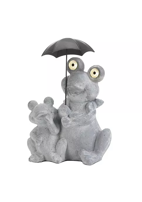 Whimsical garden figurine is a mom and baby frog hanging out on a rainy day.