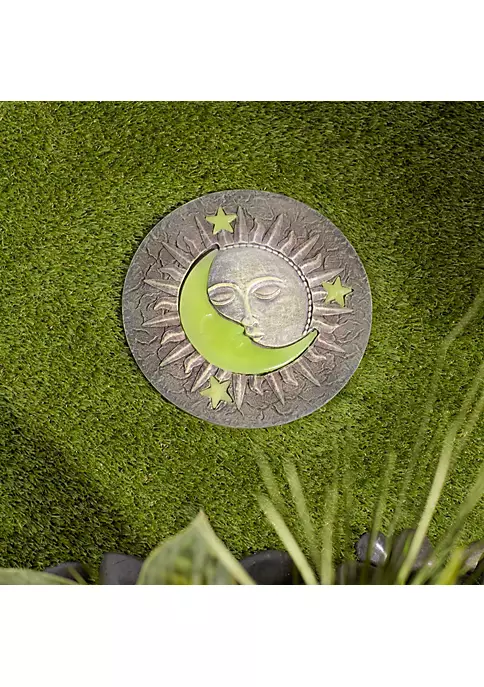 This unique Polyresin. stepping stone features the sun and a yellow crescent moon, along with a few stars. By day, the sun and moon are a beautiful work of art together. At night, the moon and stars will glow after soaking up some sunlight during the day. 3 pounds. 10.2 inches in diameter x 0.5 inch thick. Polyresin.