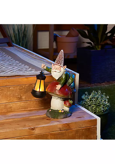 This charming garden accent features a solar panel that soaks up the sun by day, and then at night, the gnome’s black lantern shines in the dark. Cute details include a little snail and homey flowers.