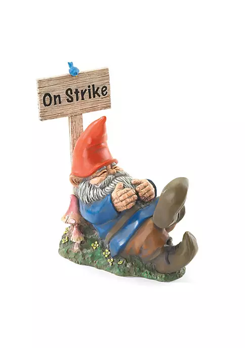 This hardworking gnome is standing up for (or laying down for?) his rights! Cute chubby guy is all tuckered out. This would look adorable in a garden, or even indoors.
