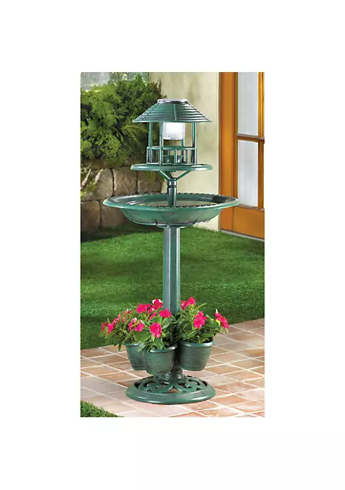Three-in-one decoration, with a birdbath, planters, and a solar-powered light. Made of plastic that has the look of metal, it is lightweight, yet it’s sturdy and will hold up in all types of weather. Some assembly required. One AA battery included. Plants not included.